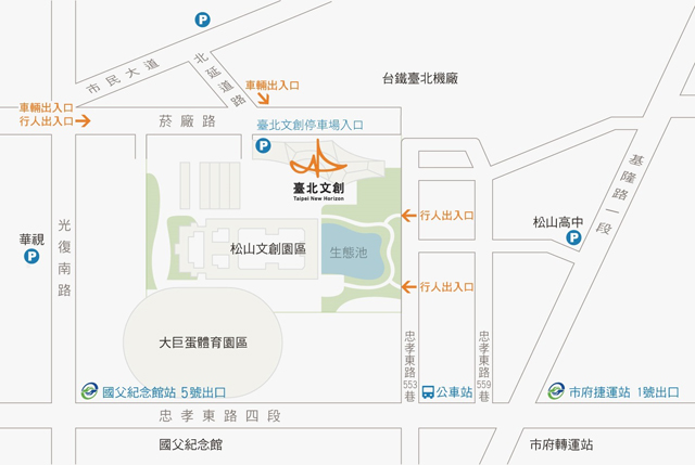 【板南線】市政府站1號出口,自忠孝東路四段右轉553巷,步行約400公尺 【板南線】國父紀念館捷運站5號出口,自光復南路右轉菸廠路,步行約500公尺